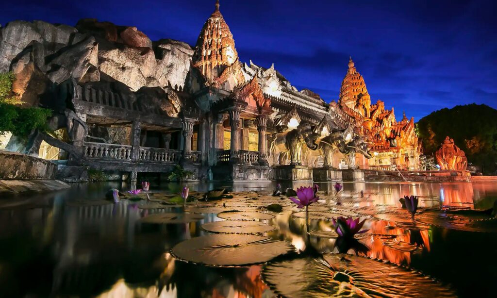 The palace resembles an ancient stone temple, with sculptures of elephants and images from Asian mythology.