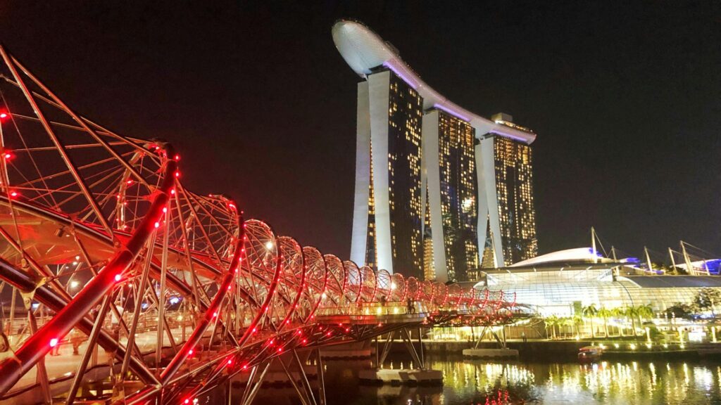We will cross the brilliant DNA Bridge (Helix Bridge), a stunning piece of architecture, illuminated in the night city.