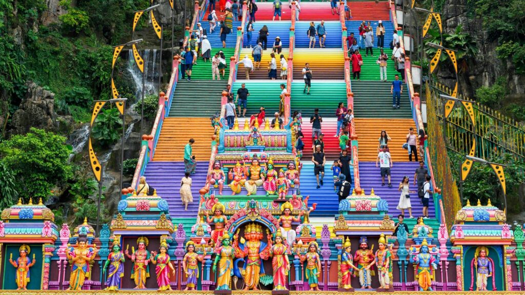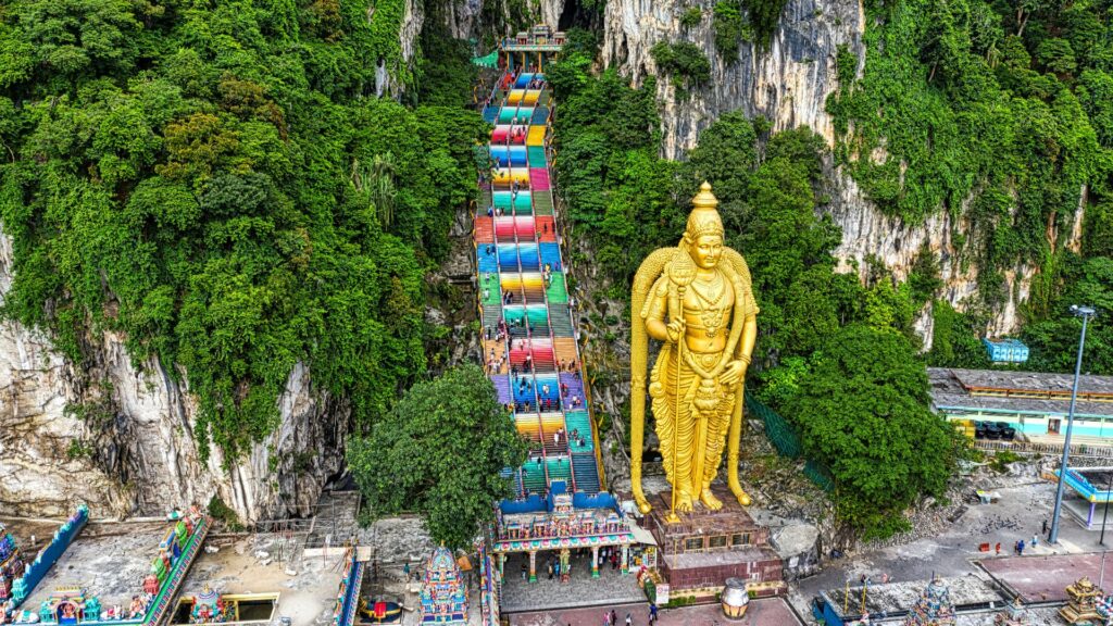The Batu Caves are located on the outskirts of Kuala Lumpur and are considered one of the most famous Hindu holy sites outside of India.